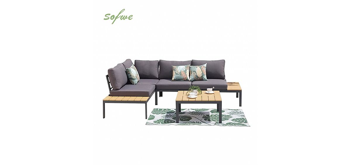 Multifunktional: Sein stilvolles Erscheinungsbild und sein gut gestaltetes Design können die Schönheit von Außenbereichen verbessern. Das Set besteht aus einem bequemen Ecksofa mit verstellbarer Rückenlehne und einem Tisch. Darüber hinaus verfügt er über zwei seitliche Ablagen, die sich sehr gut zum Abstellen von Gläsern, kühlen Getränken und sogar Zeitschriften eignen und mehr Stauraum bieten.