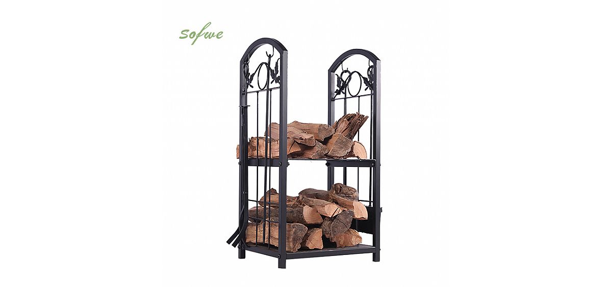 Das Kaminholzregal von Sofwe hat ein ergonomisches Design mit stabilen Eisenhaken zum Aufhängen des mitgelieferten Zubehörs, damit Sie das Feuer einfach pflegen können. Diese Werkzeuge sind sehr nützlich, um die Feuerstelle und die Brennholzumgebung sauber zu halten. Ein starkes Holzregal aus Metall ist die effektivste und kostengünstigste Art, Brennholz zu konservieren. Es wäre besser, Brennholz mit einer Erhebung über dem Boden und einer atmungsaktiven Abdeckung zu kaufen, um Schutz und Luftzirkulation zu bieten. Dadurch verrottet oder verschmutzt Ihr Brennholz nicht.