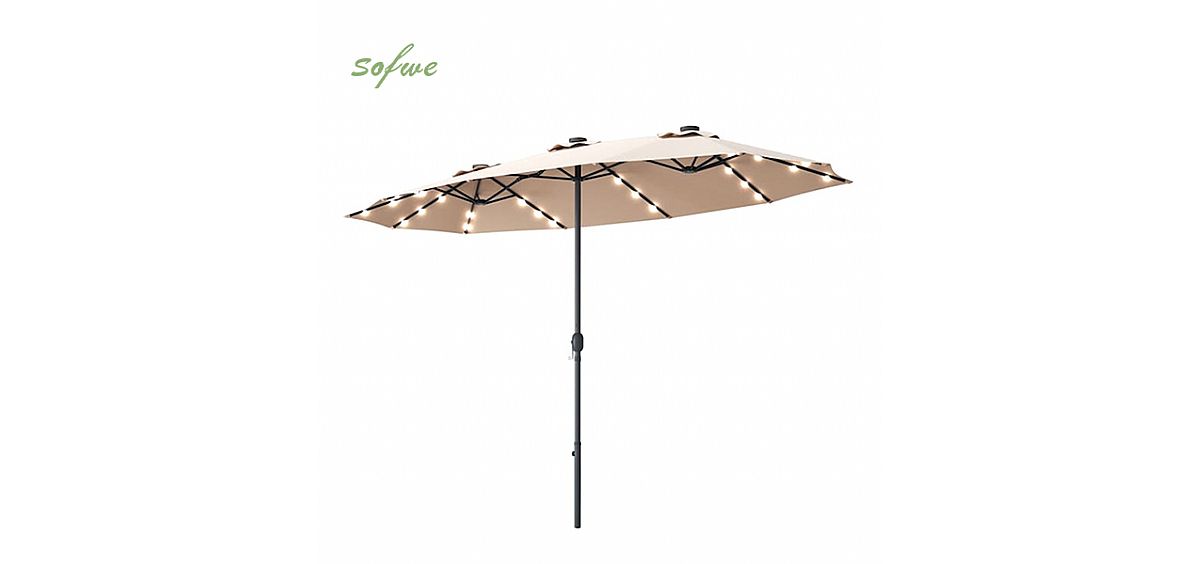 Ein hochwertiger Outdoor-Sonnenschirm sollte viele Jahre halten, bei Bedarf einfach zu bewegen oder zu modifizieren sein und niemals zu einem Ärgernis werden. Dieser Sonnenschirm bietet Schatten vor Sonne und Regen, Schutz vor schädlichen UV-Strahlen und ist ein Sommerparadies für Ihre Familie und Freunde, um sich am Pool oder auf der Terrasse zu entspannen. Das Öffnen und Schließen des Regenschirms wird durch handgekurbelte Griffe erleichtert. Es kann allein oder mit einem Couchtisch verwendet werden, um die Funktionalität zu erweitern. Die gesamte Fläche des Schirms hält dank seiner 15 starken Rippen jedem Wetter sicher stand. Es widersteht Verformungen gut und hat eine beträchtliche Wirkung gegen den Wind. Darüber hinaus verfügt der Regenschirm über integrierte LED-Leuchten, die Sie für die nächtliche Beleuchtung verwenden können.