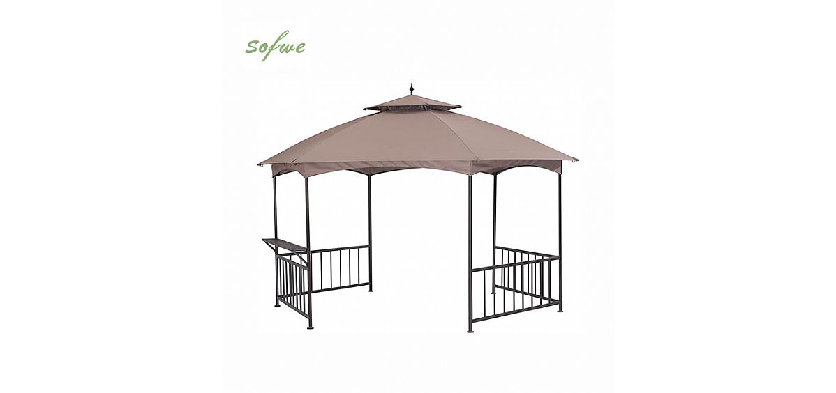 Design: Das einzigartige Design, die kompakte Struktur und die einfache Montage können Ihre verschiedenen Anforderungen erfüllen. Es ist ein modisches Zelt mit modischen Geländern und Regalkanten, das umfassenden Schutz bietet. Es verfügt auch über einen robusten, langlebigen sechseckigen Pavillon, der Wind und Regen standhält, sodass Sie bei Outdoor-Aktivitäten eine angenehme Umgebung genießen können. An der Seite befindet sich auch ein Essregal. Sein luxuriöses Pavillon-Design kann mit Ihrem Garten im Freien kombiniert werden und bietet einen perfekten Freizeitbereich.